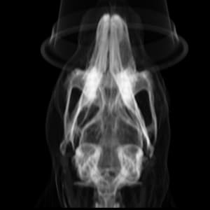This case exemplifies very well how digital visualisation can help doctors see the problem adequately and make the right decision regarding operations. A vet sent us the CT image of a rabbit’s head for further analysis because the imaging examination detected a tumour in the back part of the nasal cavity near to the olfactory bulb. As he wanted to perform a minimally invasive surgical intervention, he asked us to create a 3D model making the position of the tumour more visible. We made the model and we could suggest an alternative surgical approach during the consultation.